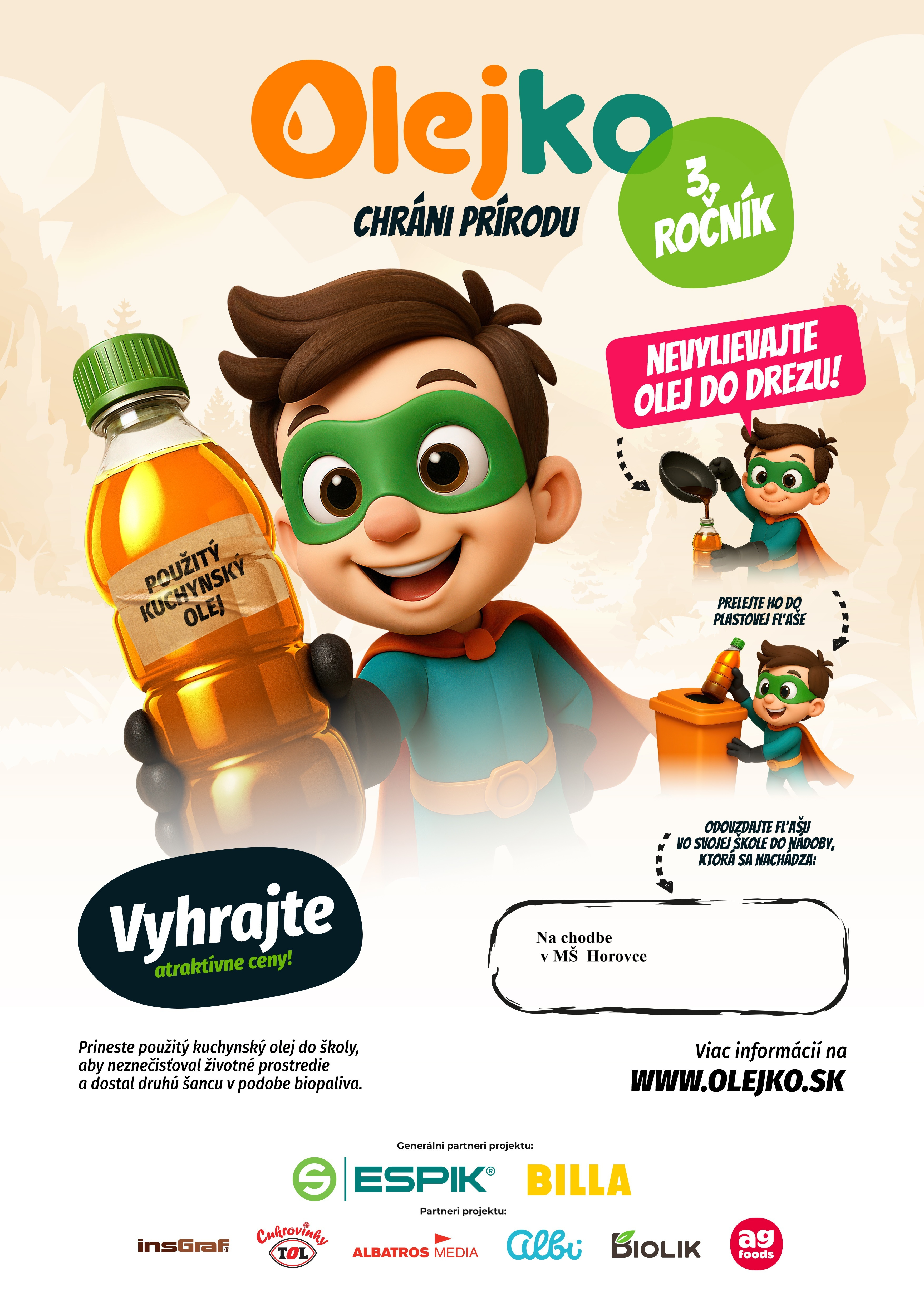 Prineste použitý kuchynský olej do budovy Materskej školy v Horovciach, aby neznečisťoval životné prostredie!